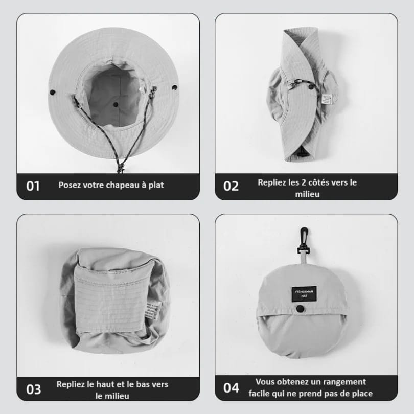 Ce chapeau de randonnée se distingue par sa pliabilité ingénieuse. Compact, il se replie en une forme plate qui peut aisément se ranger dans son sac de transport, prêt à être déployé quand le soleil se montre.