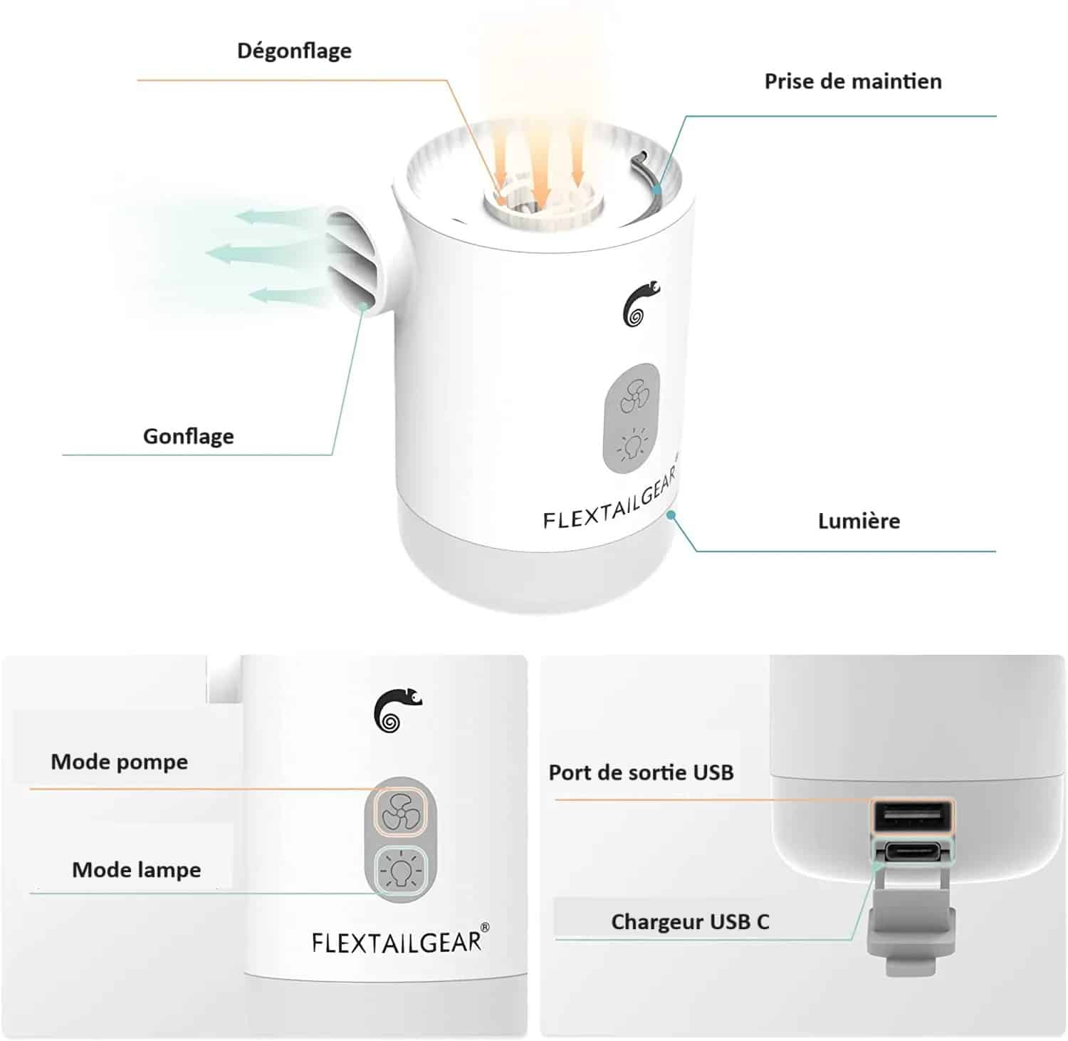 Cette pompe électrique étanche, outre sa fonction principale de gonflage et dégonflage rapide, fait preuve d’une ingéniosité remarquable en intégrant une lampe de camping LED, offrant une source de lumière rassurante durant les nuits étoilées. Sa capacité de chargeur d’urgence pour vos appareils électroniques vous assure une sécurité supplémentaire en cas de besoin.